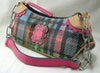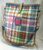 11” X 7” X 3”, fold over front, toggle front closure, plaid side panels, silver hardware, zippered inside pocket, 4 pockets total, fully lined interior, hangtags.