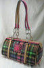 12” X 9” X 4”, fold over front, toggle front closure, plaid side panels, silver hardware, zippered inside pocket, 4 pockets total, fully lined interior.