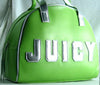 12” X 7” X 4” Double hand straps, star and heart dangle, 4 feet, “Juicy World” logos on fabric, zipper pulls, inside zippered pocket, 4 pockets total, fully lined.